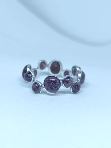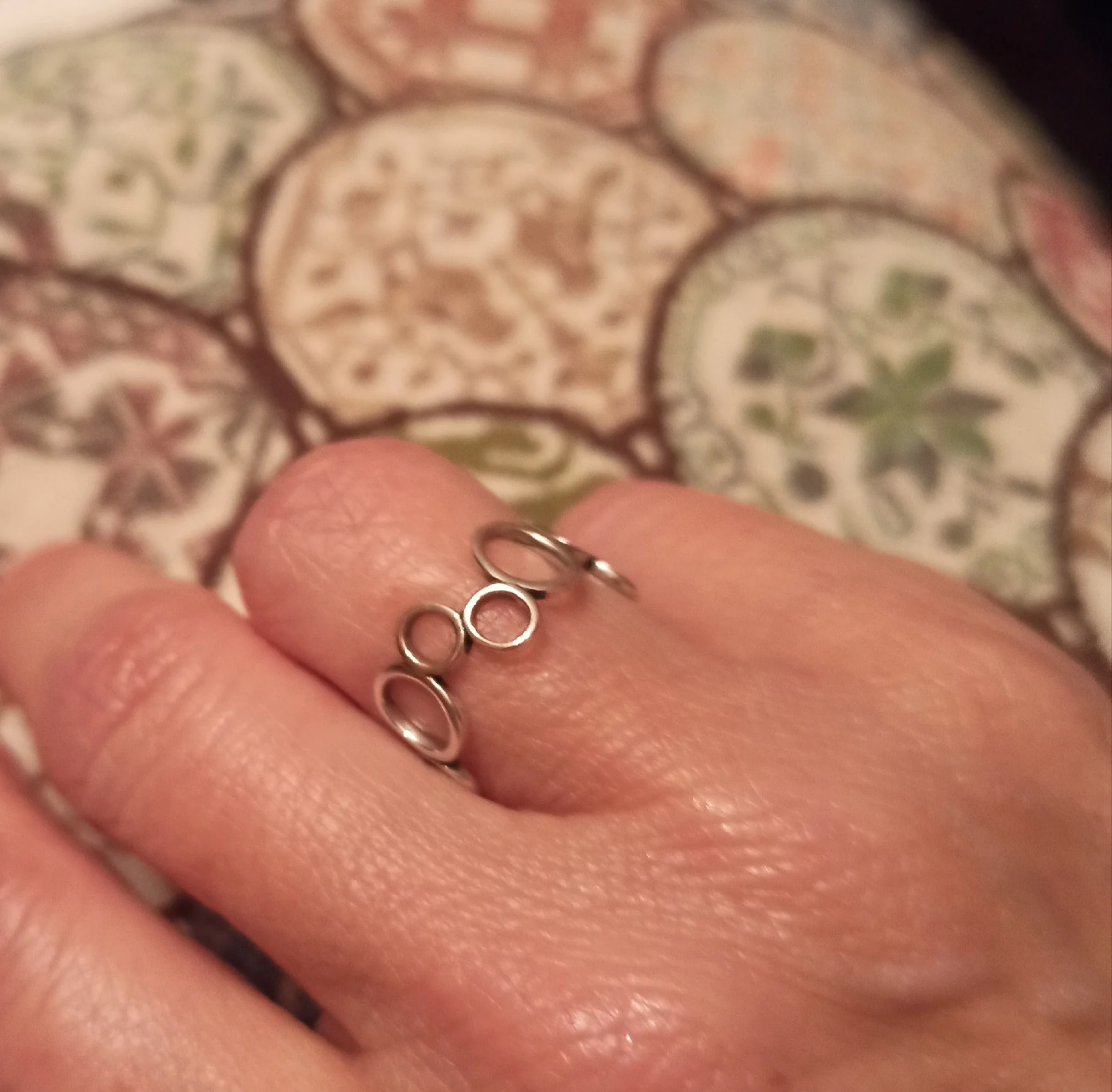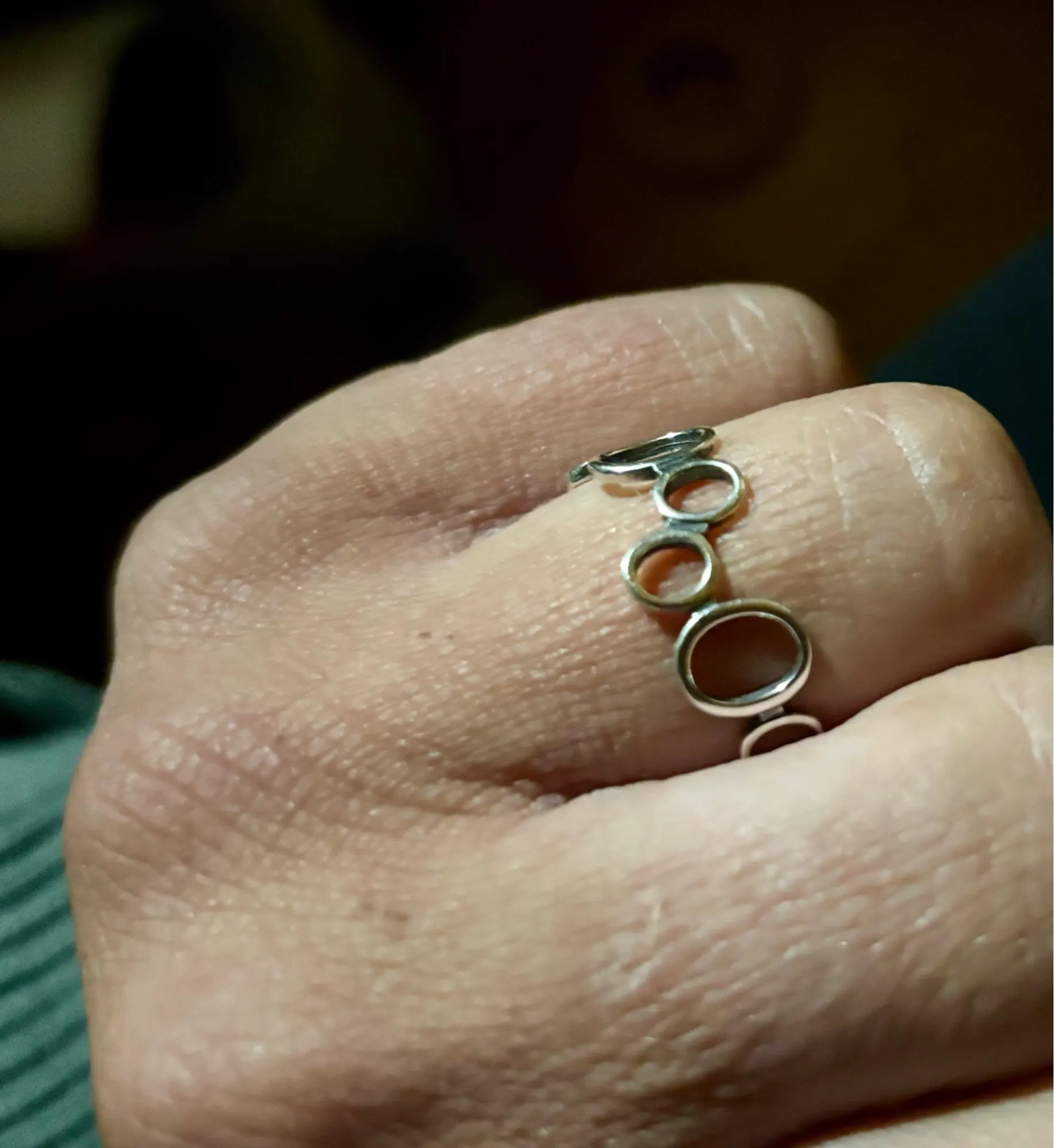 バブルが連なったようなデザインが可愛いし、シンプルすぎないのでこれ一つ着けてれば手もとが寂しくなくていい感じです。厚みが0.6ミリほどの薄さに軽やかで、嵌め心地がとても快適。デイリー使いしたいほど気に入りました。