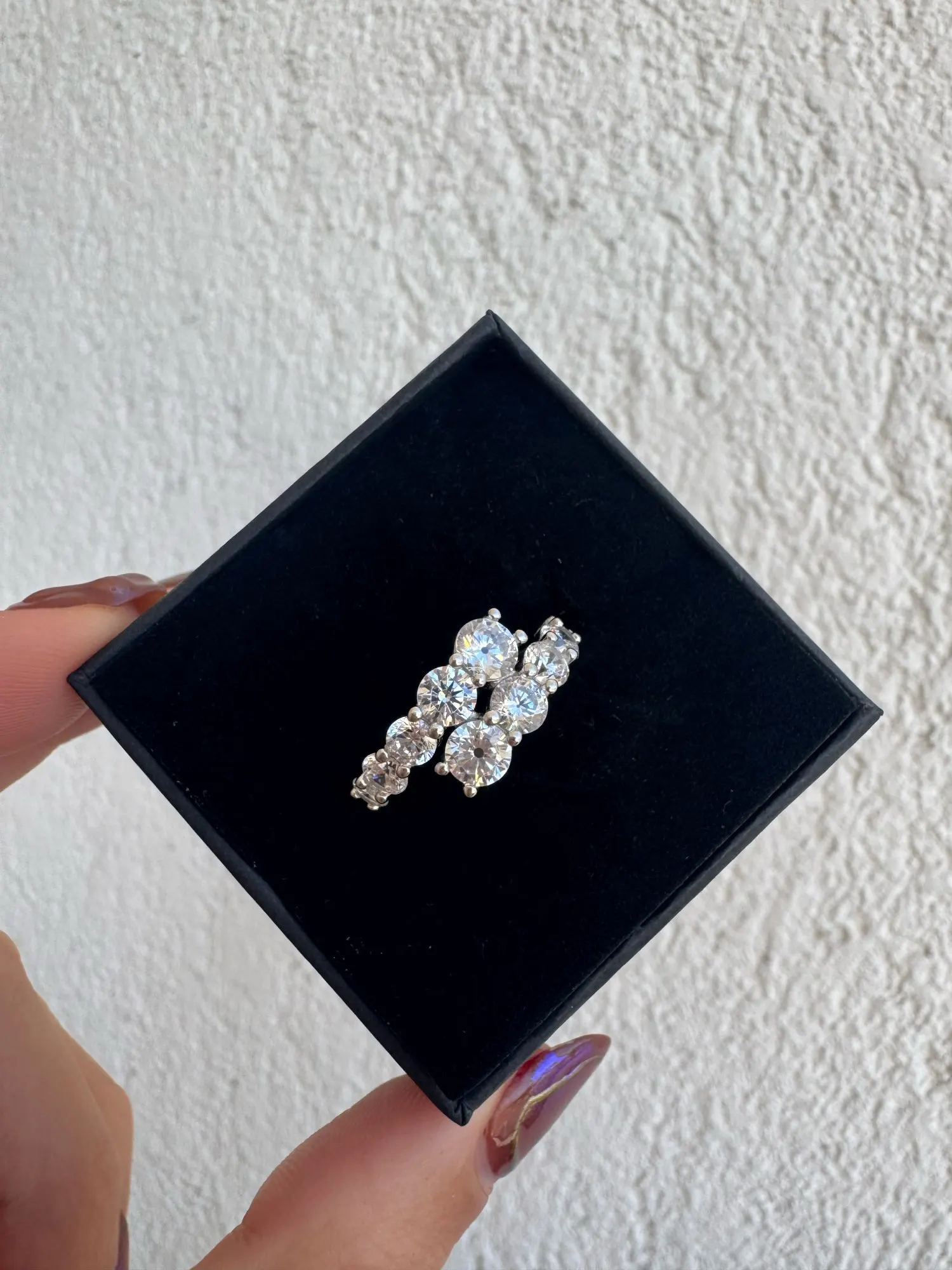 ジルコニアが指の上で輝きのブーケのように煌めくリング。ボリュームのある美しいデザインが、手元全体を華やかに見せてくれます。着けるだけで特別な気分になる、コーディネートの主役になるゴージャスな一品です。