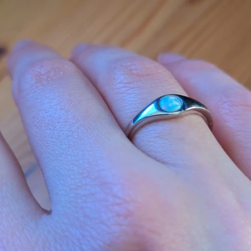 Pretty ring with a clean, elegant design. Fits around size 50 mm when closed. Slightly adjustable, but the open band can catch on skin and feel uncomfortable. Best for small fingers.