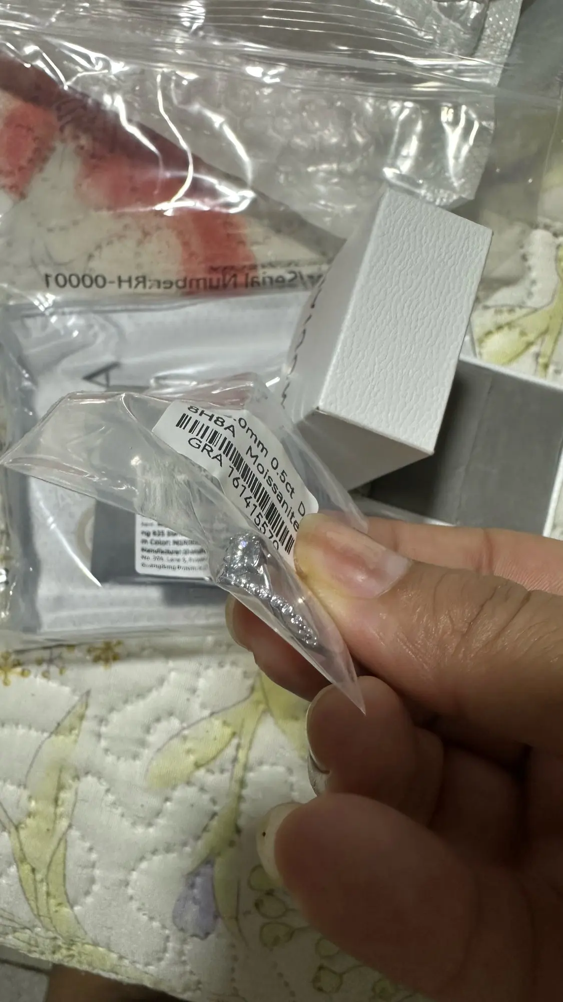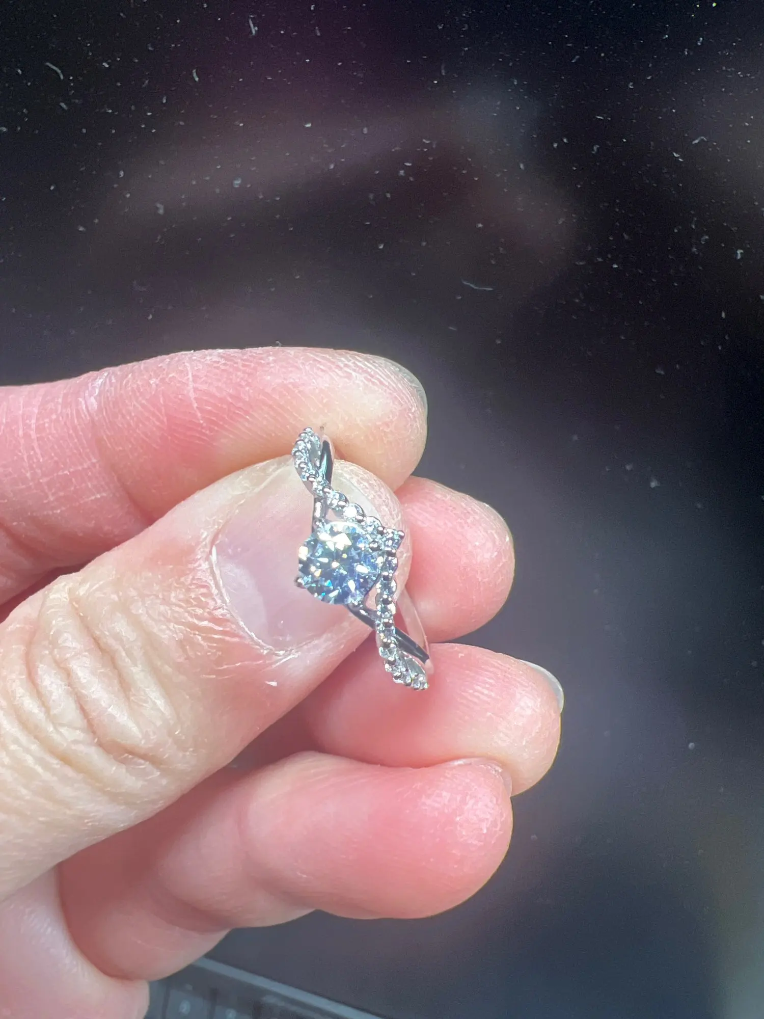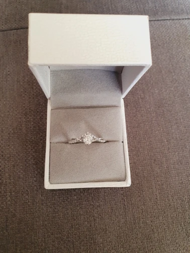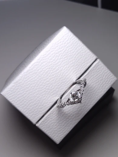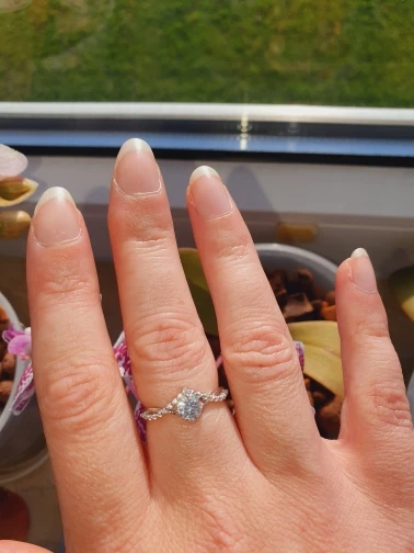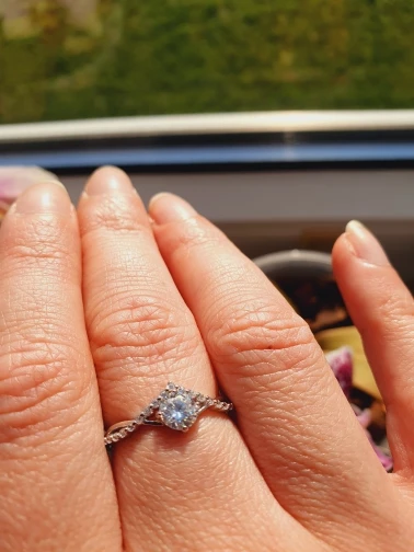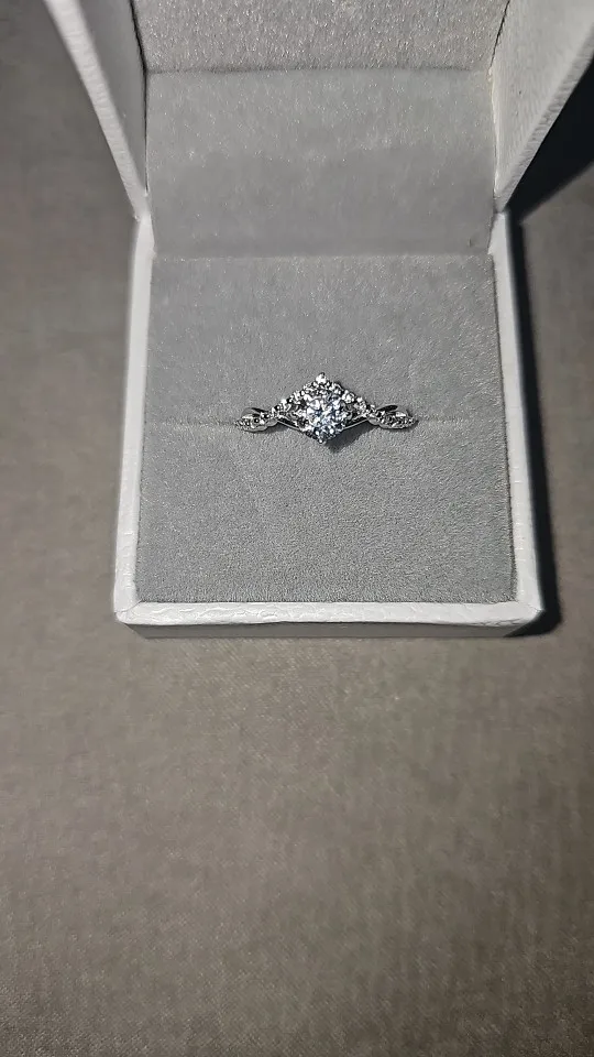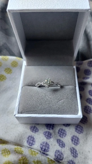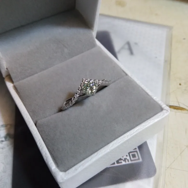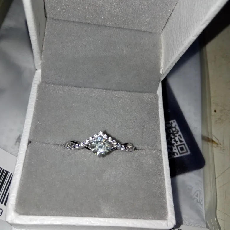 Schöner Ring. Die Probe S925 7 ist vorhanden. Dazu bekommt man eine schöne Verpackung und ein Zertifikat. Die Steine funkeln, aber nicht mehr als andere aus Zirkonia. Der größte Stein sitzt ein bisschen schief.