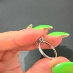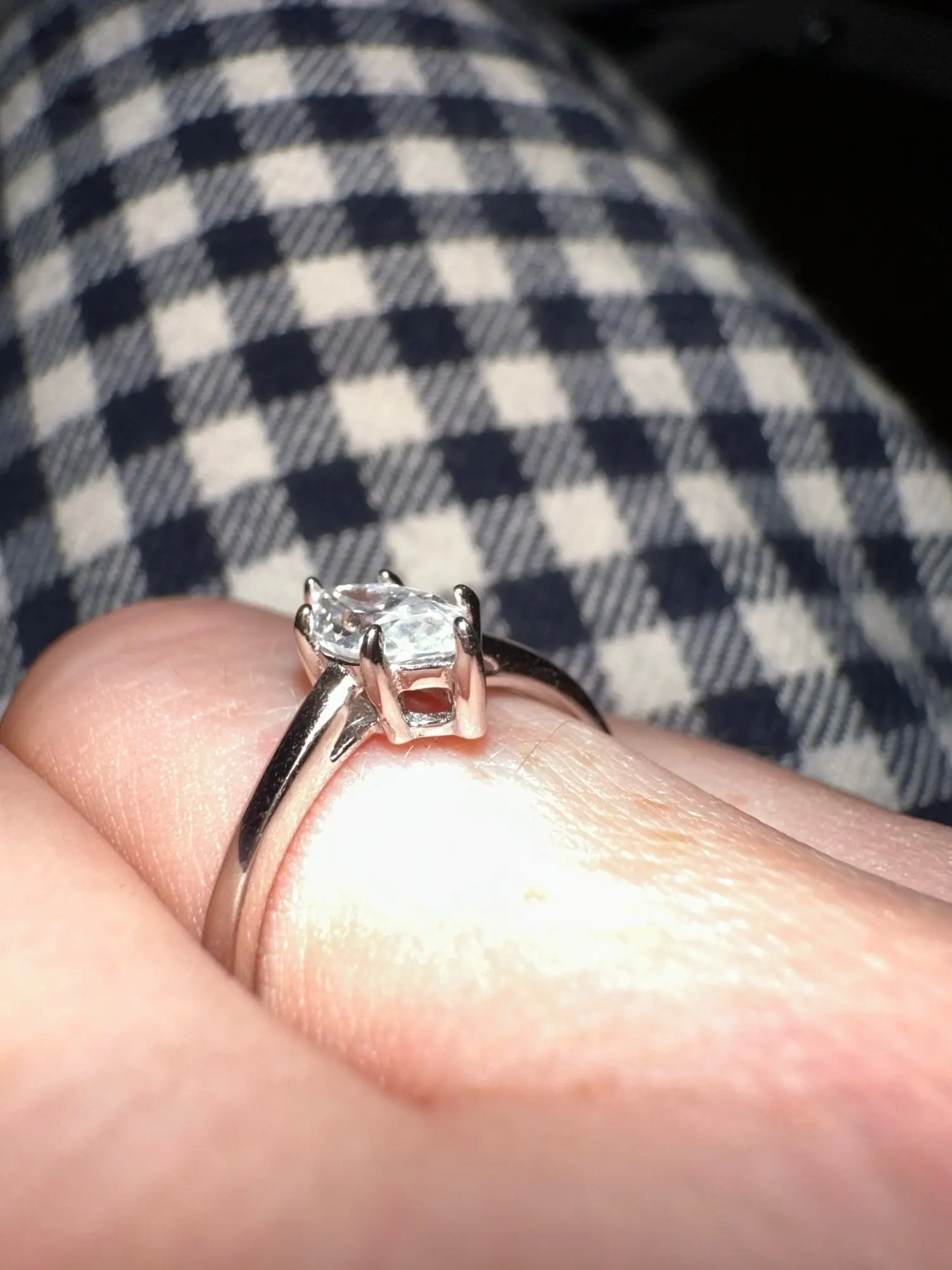 🙂 I’m really pleased with the ring: it sparkles incredibly, looks neat and expensive. 🙁 But I don’t like the way the ring is attached. The clasps aren’t secured (you can see them sticking up in my photos), and the ring scratches you a lot and gets caught on everything, which is incredibly annoying. So I don’t know if I’ll be able to wear it. I also haven’t checked if it’s sterling silver, but the stone’s code is reflected on the website via a QR code.