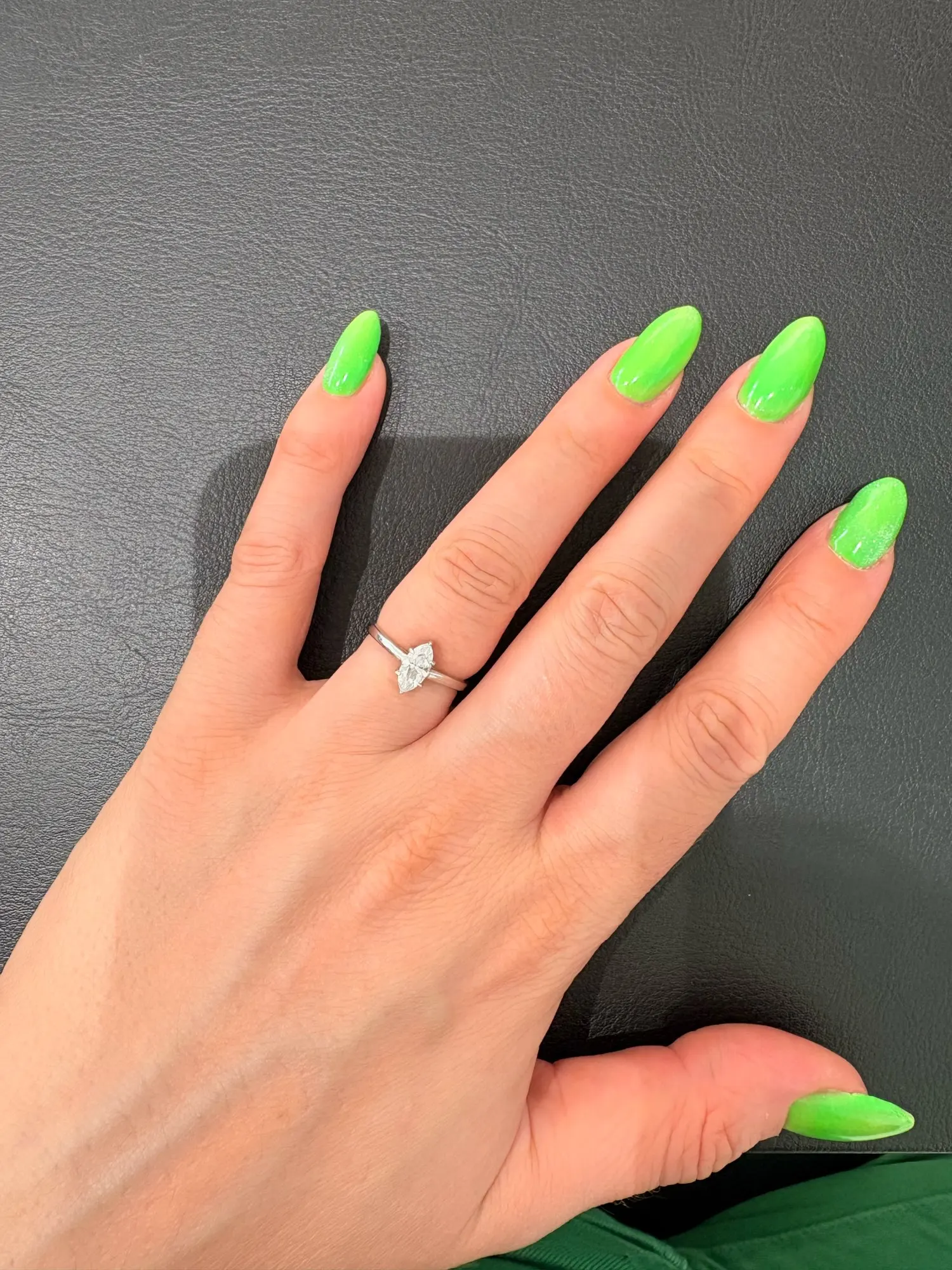 高貴な輝きを放つマーキスカットのモアッサナイトリング。シャープで洗練されたデザインが、指を細く長く見せてくれます。これ一本で主役になる存在感があり、手元をエレガントに演出する美しいジュエリーです!!!