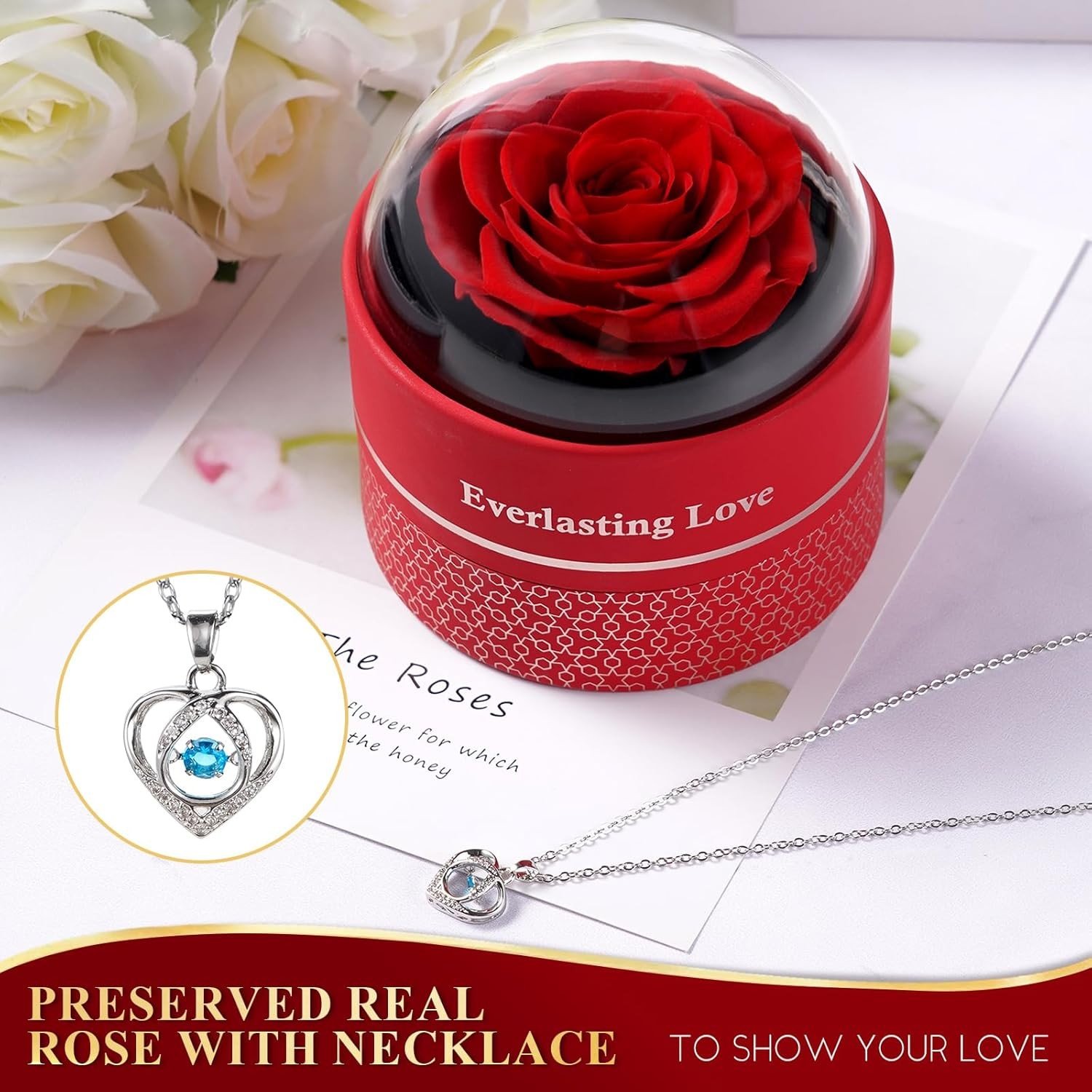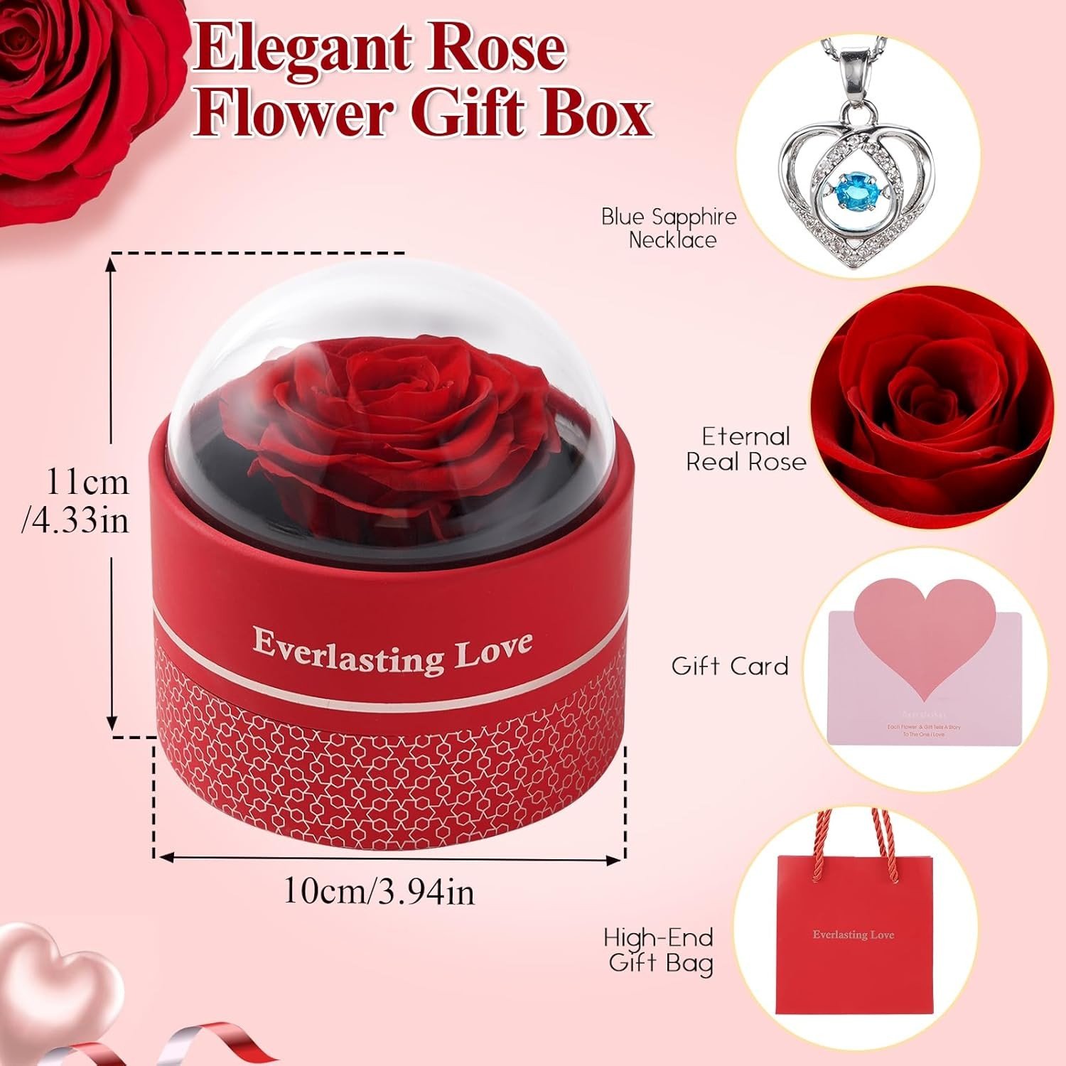 - 🌹【Eternal Love】:The Eternal Red Rose is made from natural fresh roses. Eternal flowers represent eternal love. Comes with a blue gemstone necklace, paired with an open top circular gift box and a blessing card. The combination of blue gemstones and roses symbolizes the only eternal and unchanging love, making it the best gift for mothers, grandmothers, wives, and girlfriends, as a forever beautiful memory.